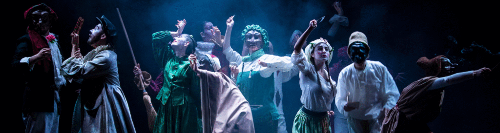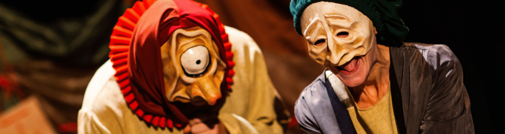 Máscaras de aquí y de allá es un espectáculo coral y festivo en el que los artistas invitados a la edición 2026 comparten breves escenas y lazzi creados a partir de sus máscaras y tradiciones. Un encuentro de estilos, idiomas y personajes que celebra la Comedia del Arte como un lenguaje universal y vivo.